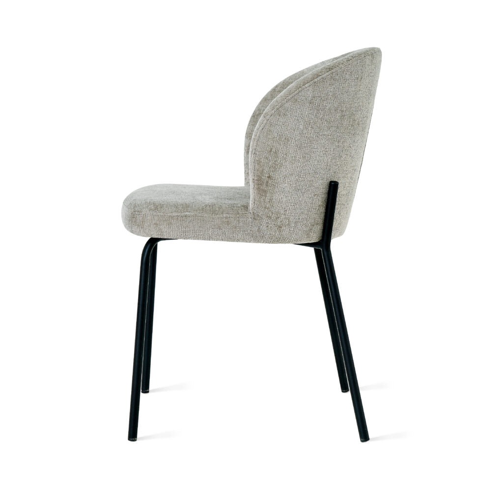 Dankzij het ontwerp zonder armleuningen is de Leia bijzonder praktisch; je schuift hem moeiteloos onder elke tafel en hij neemt visueel minder ruimte in beslag. De kuip rust op vier slanke, zwarte metalen poten, wat zorgt voor een moderne en luchtige *finishing touch*.