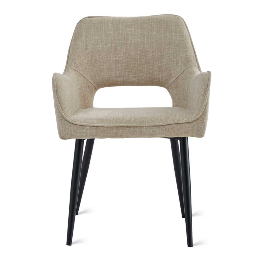 Wat deze uitvoering zo bijzonder maakt, is het spannende contrast tussen de zachte, lichte bekleding en het stoere onderstel. De vier uiteenlopende poten van zwart metaal geven de elegante kuip net dat beetje extra pit. Hierdoor is de Raisa in crème geen saaie stoel, maar een verfijnde eyecatcher aan je eettafel.